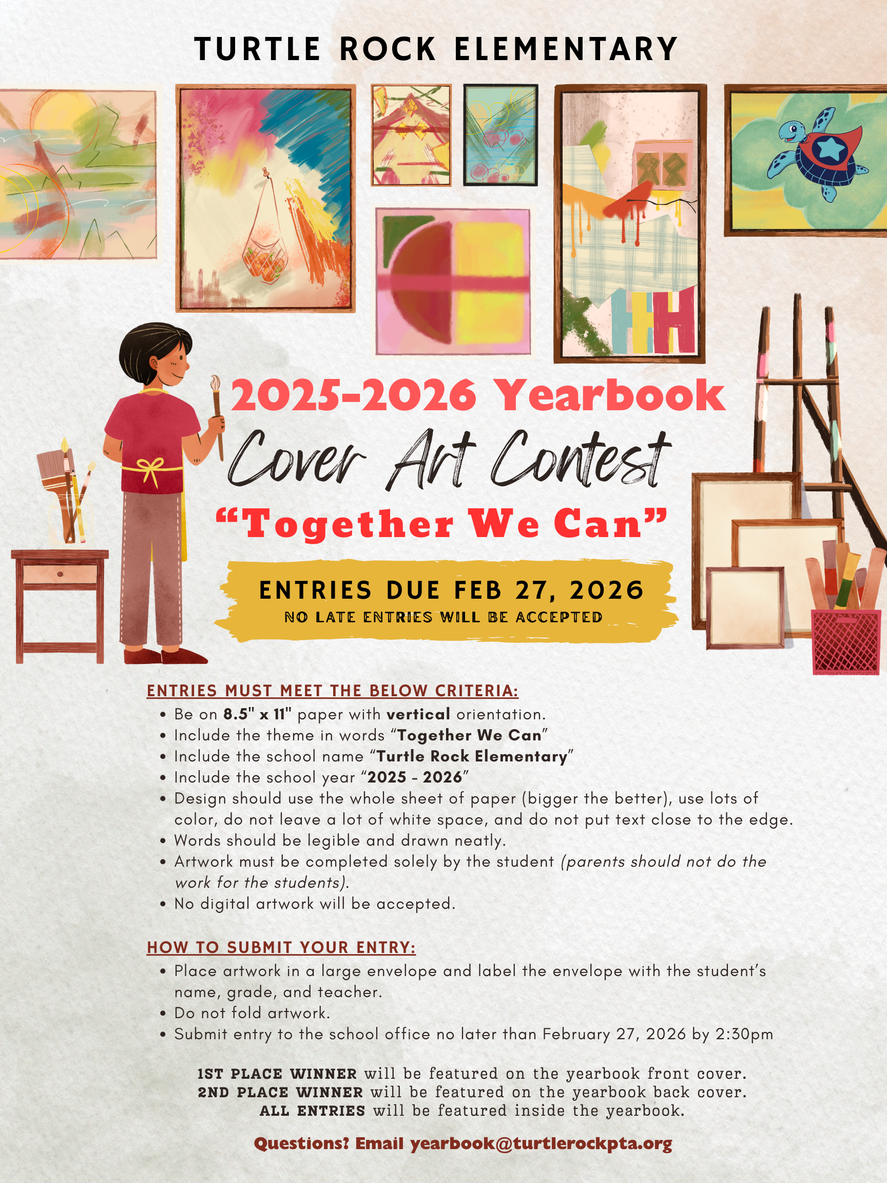 Buy your yearbook on Treering (School passcode 101663184877574). Yearbooks will be delivered to Turtle Rock Elementary at the end of the school year.
